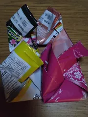 何でも折りパケ😆 今晩の我が家でのチートディ分です💓 Calbeeさん、ごめんなさい🙇♀お土産でいただいた海老せんべい某メーカーのカレー味のもの 折りパケのクセがついてて無意識に何でも折ってしまいます😅